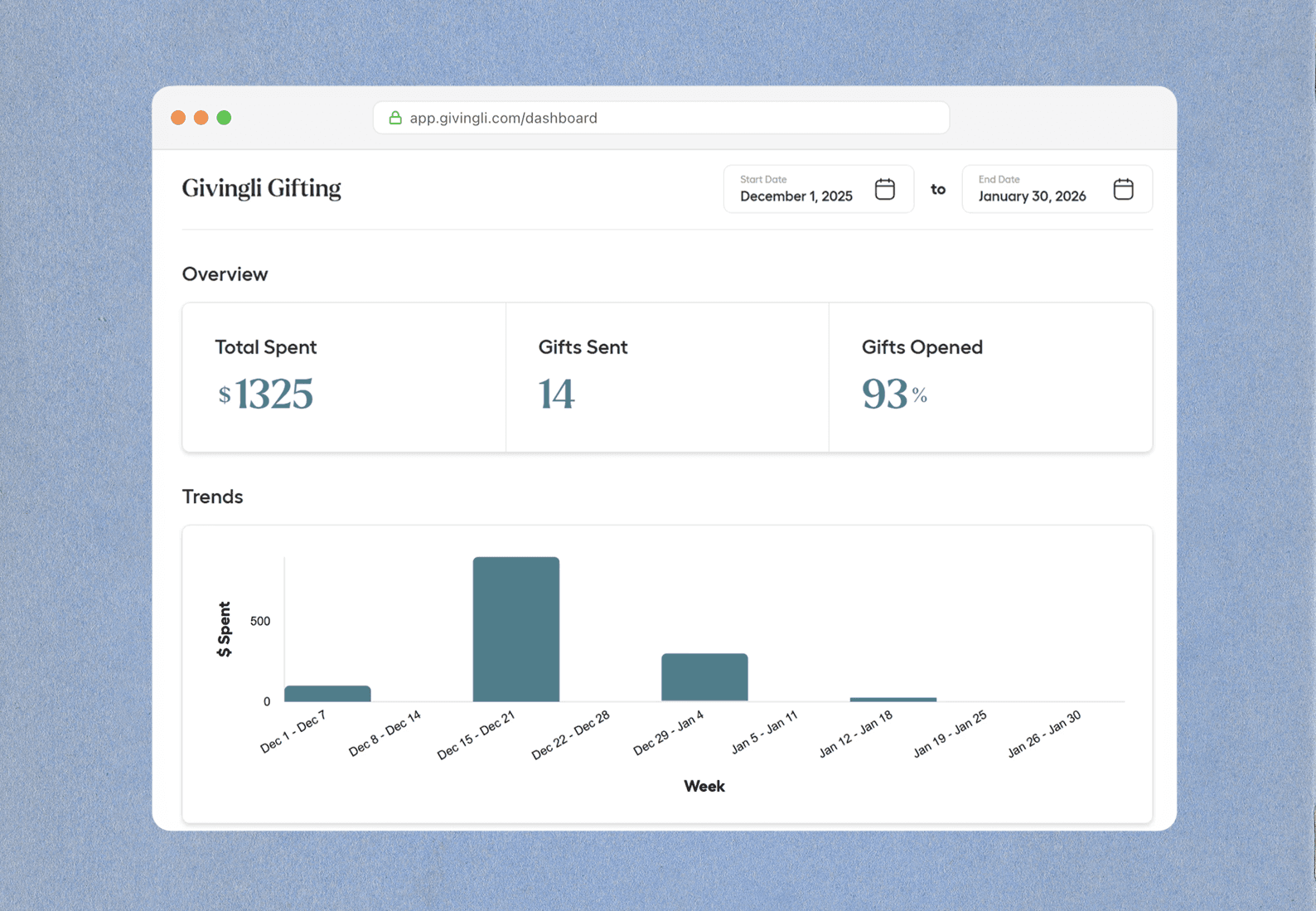Givingli Pro tracks every gift from send to redemption, so you always know what's working and what isn't. See how our reporting and tracking features work →